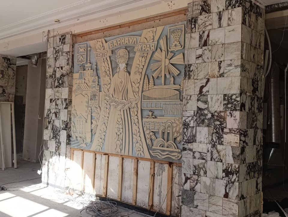 В барнаульском "Доме под шпилем" в одном из помещений во время ремонта была обнаружена рельефная композиция советских времен. Сейчас известно, вместо магазина "Орион" там будет открыт "Банк ВТБ".