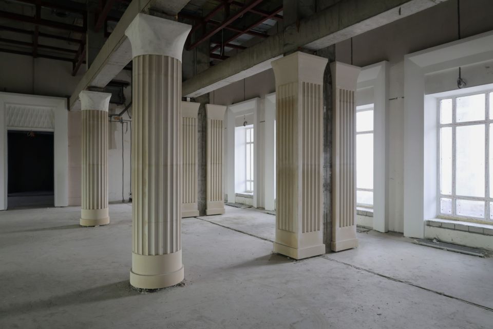 В здании не ведутся работы, но оно содержится в надлежащем виде, отапливается и охраняется. На третьем этаже уже готовы офисные помещения, заложены инженерные коммуникации, электроснабжение, системы вентиляции, водоотведедения. Далее предстоит отделка самих выставочных залов и проведение ряда косметических работ.