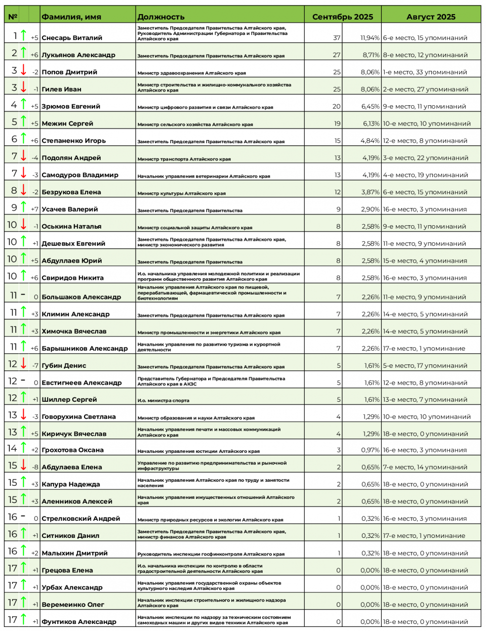В рейтинг включены заместители председателя правительства, министры, начальники управлений и инспекций. В рейтинг не включён губернатор Алтайского края, поскольку он всегда превышает по числу упоминаний иных руководителей органов исполнительной власти Алтайского края.