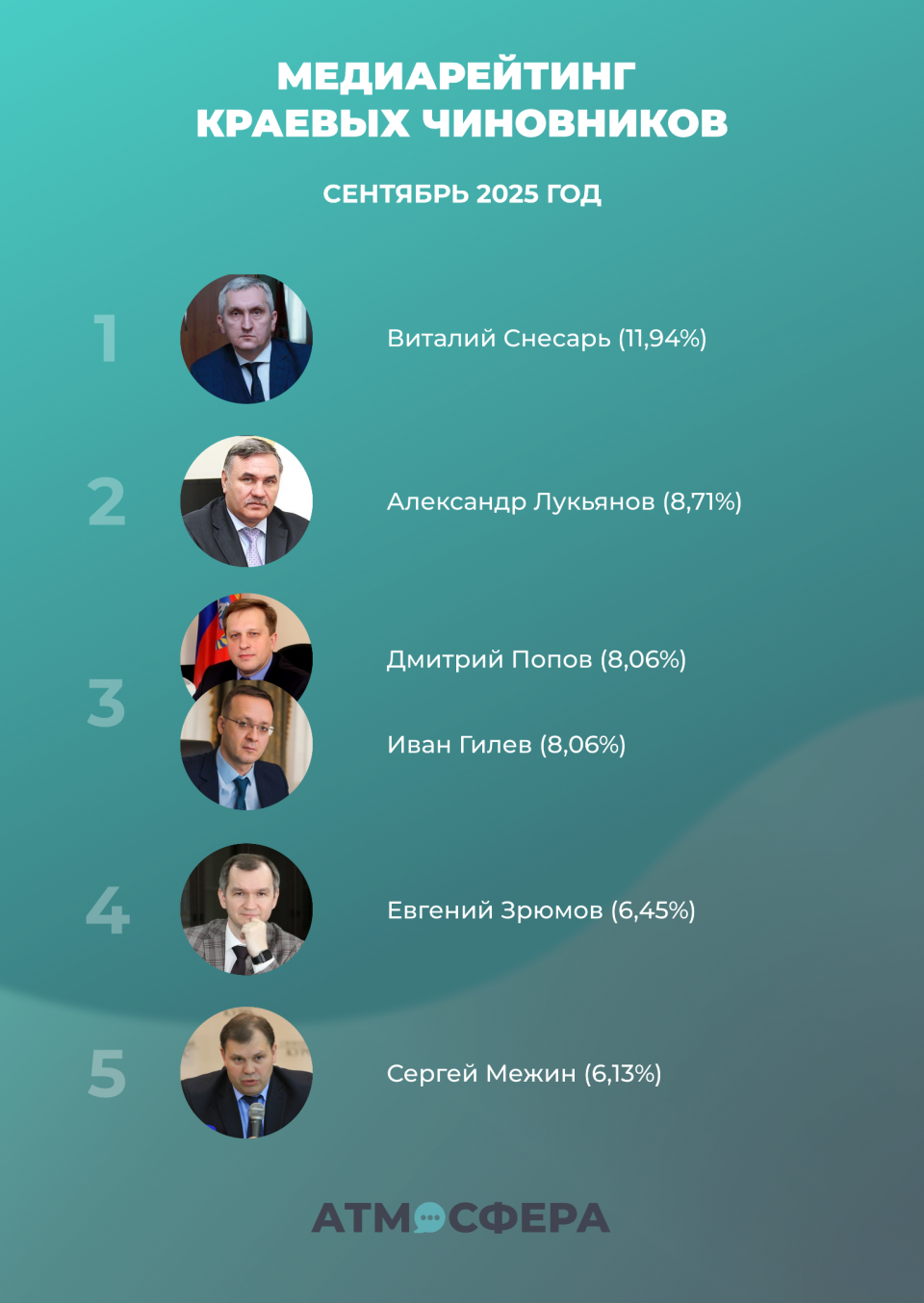 Вице-премьер Виталий Снесарь, занимавший шестое место в августе, в сентябре вышел на первую позицию. Второе место еще у одного зампреда правительства - Александра Лукьянова. В августе он занимал восьмую строчку. Лидер августовского медиарейтинга министр здравоохранения Дмиитрий Попов переместился на третье место. Его с ним его разделил министр строительства и ЖКХ Иван Гилев (второе место в августе). На четвертой строчке министр цифрового развития Евгений Зрюмов (девятое место в августе). Замыкает ТОП-5 министр сельского хозяйства Сергей Межин (10 место в августе).