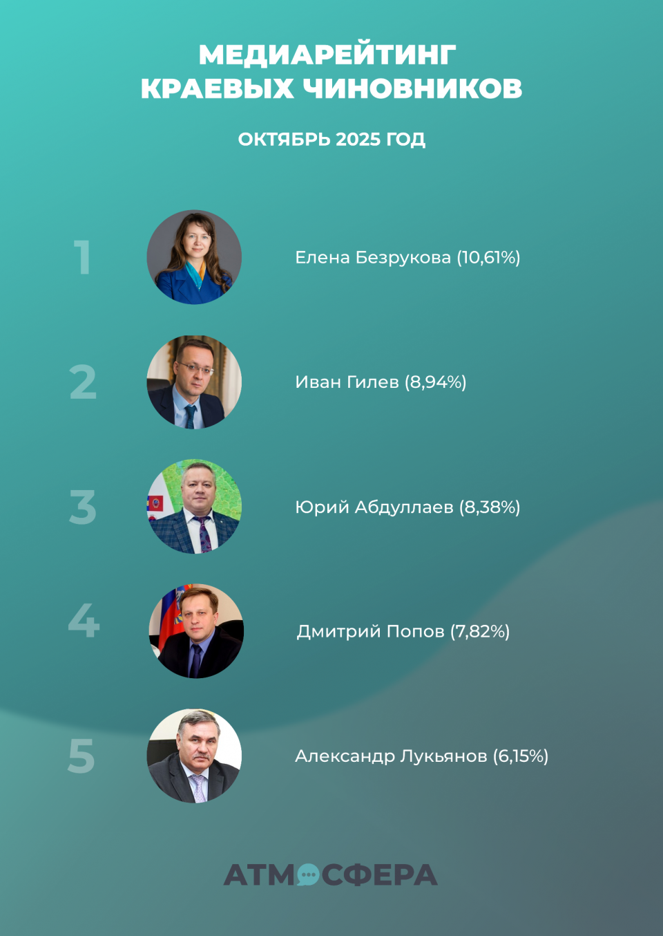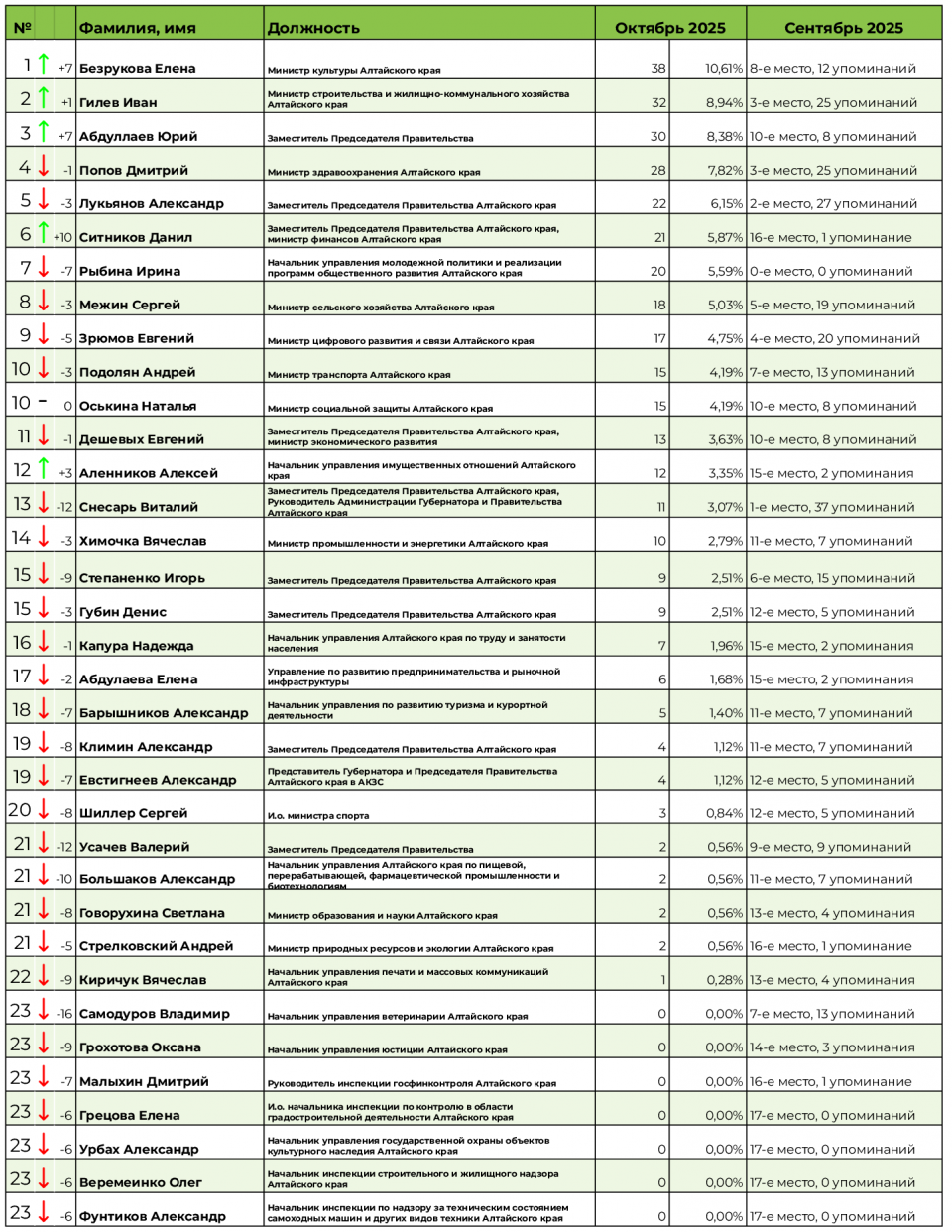 Министр культуры Елена Безрукова поднялась с восьмого места в сентябре на первое в октябре. Министр строительства и ЖКХ Иван Гилев переместился с третьей на вторую позицию. На третьем месте в октябре вице-премьер Юрий Абдулаев (10 место в сентябре). Министр здравоохранения Дмитрий Попов, занимавший третью строчку в сентябре, теперь на четвертой. Замыкает ТОП-5 вице-премьер Александр Лукьянов, занимавший в сентябре второе место.
