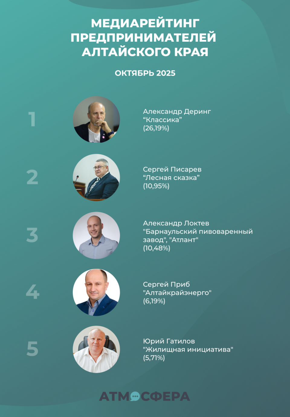 Рейтинг составляется на основе количества упоминаний предпринимателей Алтайского края информационными агентствами, порталами, сайтами газет и телеканалов: “Атмосфера”, "Амител", "Аргументы и факты Алтай", "Алтапресс","Банкфакс", "Вести-Алтай", "Катунь-24", "Комсомольская правда в Барнауле", "Алтайская правда", "Московский комсомолец на Алтае", "Толк". Подсчет производится вручную на сайтах средств массовой информации. За 100% мы берем общее число упоминаний предпринимателей в прошедшем месяце.
