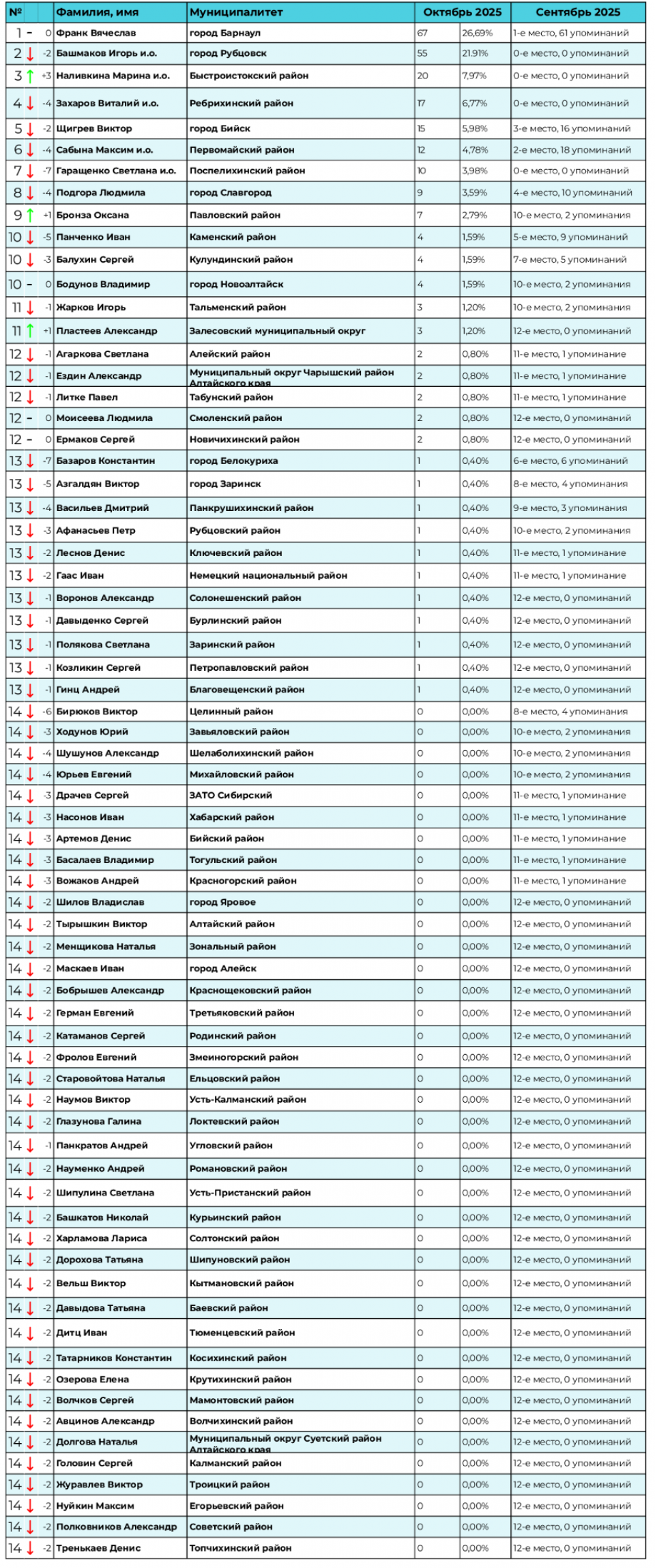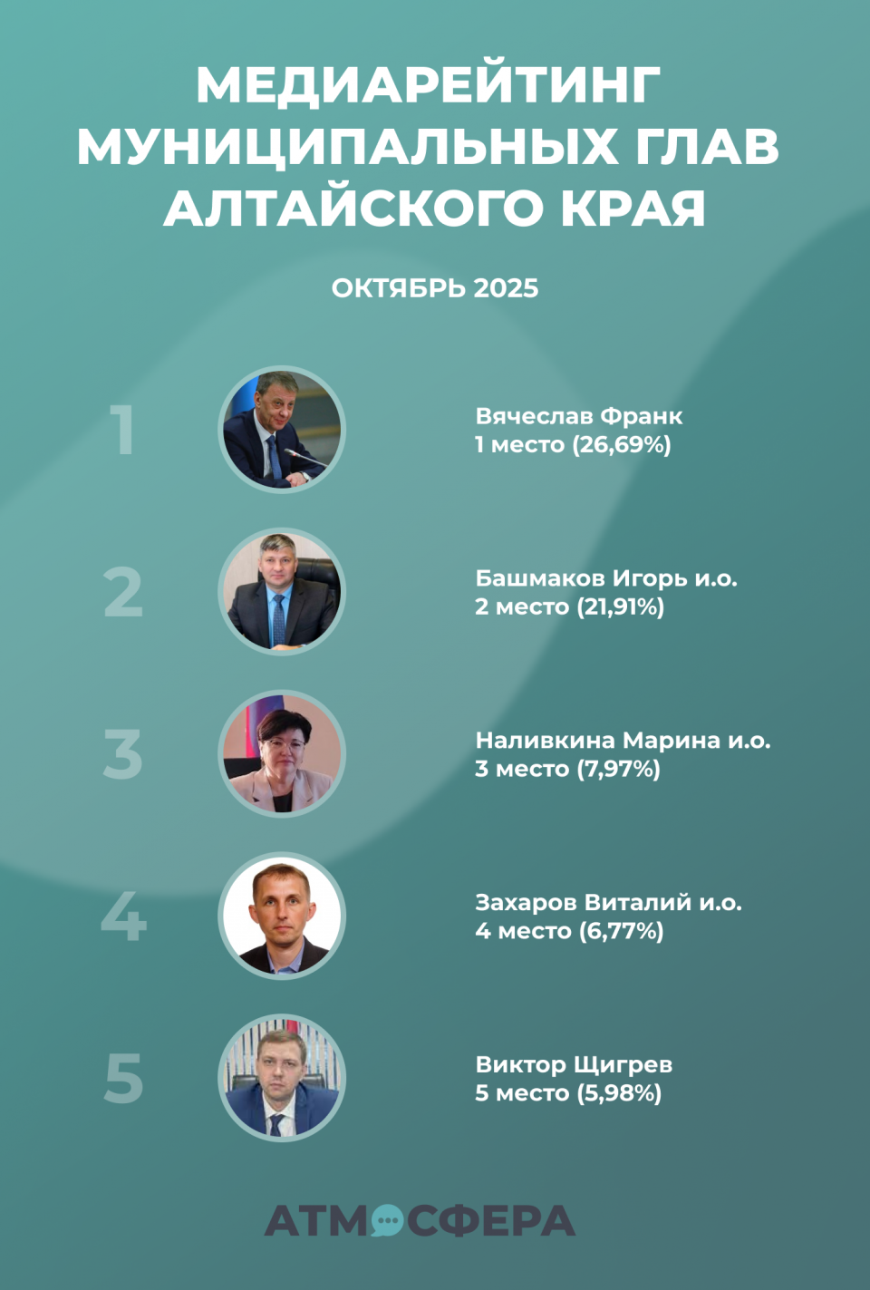 Первое место в октябре, как всегда, у мэра Барнаула Вячеслава Франка. Очень близко подошел к нему исполняющий обязанности главы Рубцовска Игорь Башмаков, назначенный вместо ушедшего в отставку Дмитрия Фельдмана. На третьем и четвертом местах и.о. глав Быстроистокского и Ребрихинского районов Марина Наливкина и Виталий Захаров. Замыкает ТОП-5 медиарейтинга мэр Бийска Виктор Щигрев.