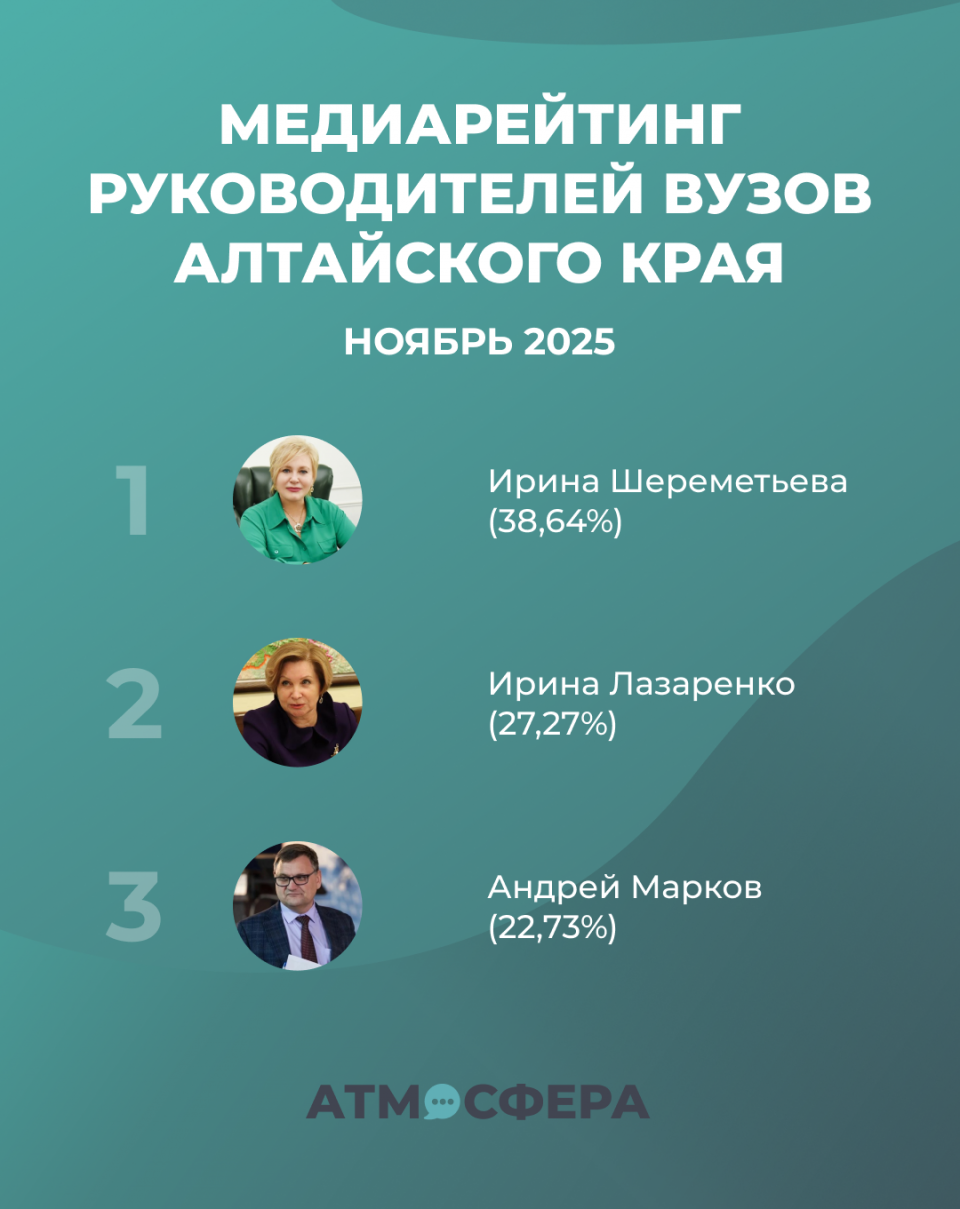 На первом месте в ноябре вновь ректор медицинского университета Ирина Шереметьева. Ректор педуниверситета Ирина Лазаренко поднялась с третьего на второе место. Занимавший его в октябре ректор политеха Андрей Марков, напротив, переместился на третью строчку.