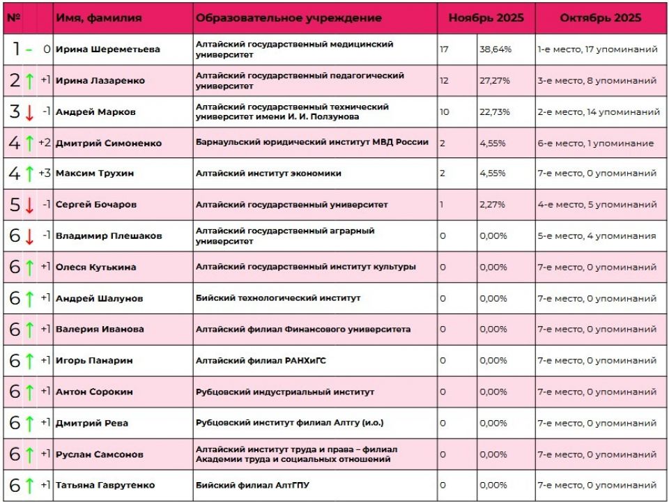 ректор Алтайского государственного педагогического университета Ирина Лазаренко – 2 место (12 упоминаний, +4 к октябрю);