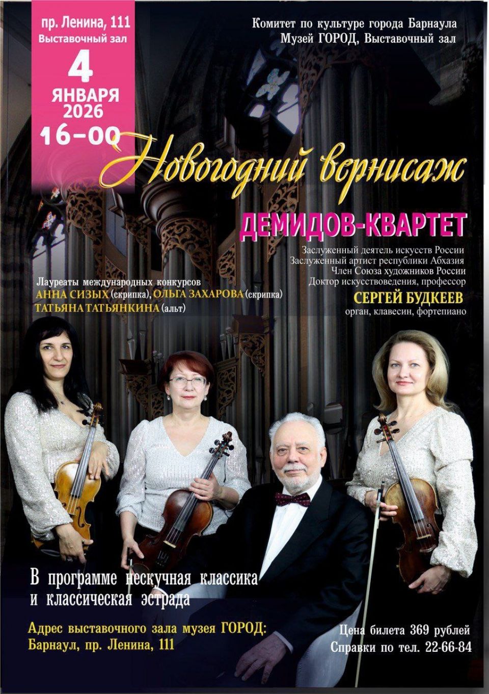 Первый концерт, “Новогодний вернисаж”, состоится в 16:00 4 января в выставочном зале Музея Город.