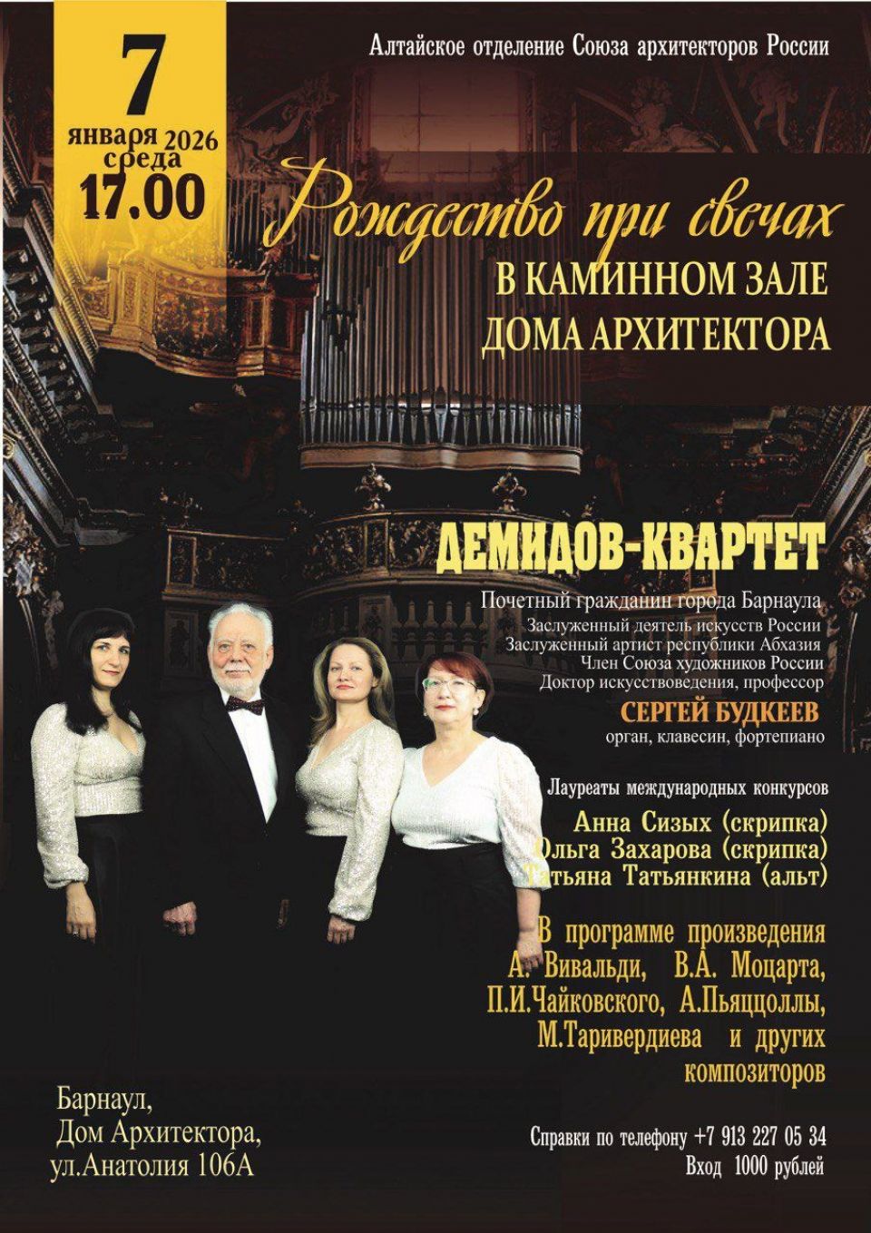 Органист Сергей Будкеев, две скрипачки и альтистка исполнят произведения Вивальди, Моцарта, Чайковского, Пьяцоллы, Таривердиева и других композиторов