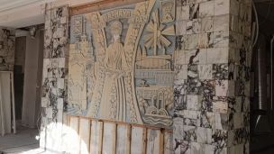 Монументальное панно было скрыто под облицовкой в помещении, где ранее находился магазин "Орион"